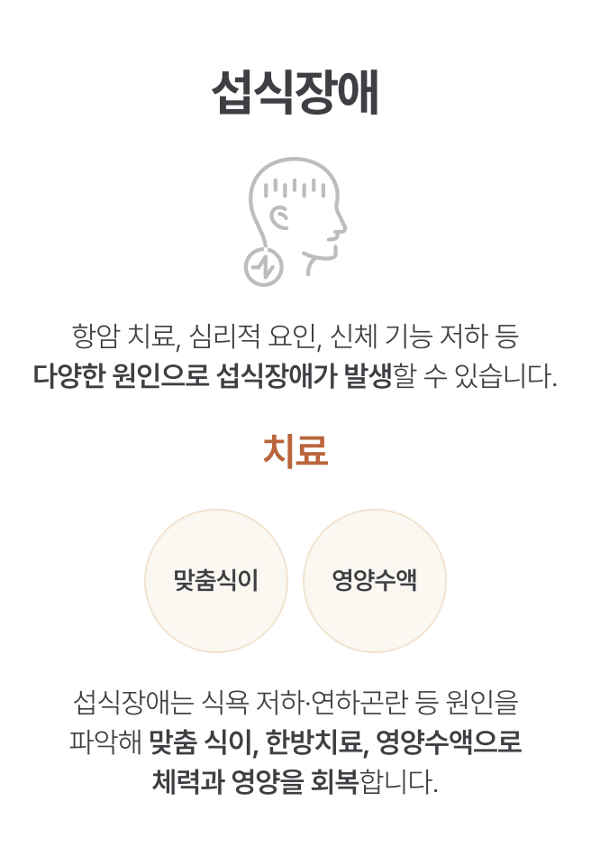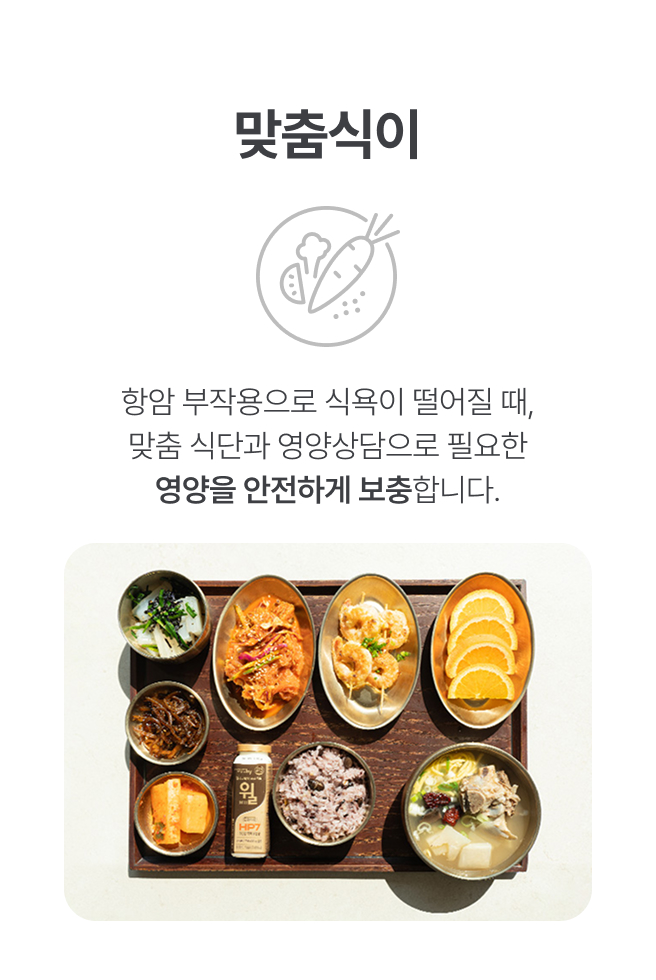 적절한 영양을 제공하여 치료 기간 동안 부작용을 줄이고 항암 치료로 손상된 조직을 회복하며, 영양 상태와 적정 체중을 유지할 수 있도록 돕는 식사를 제공합니다.