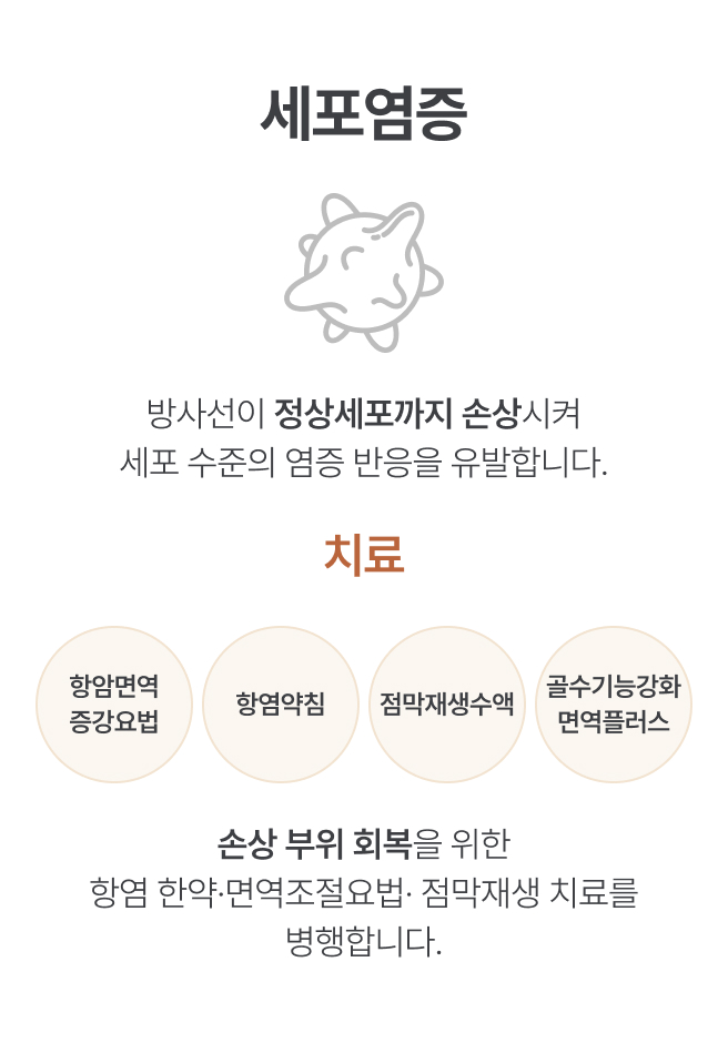 황기 부정단 처방으로 종양 면역 세포의 활성화를 돕습니다. 면역기능 증강, 골수기능 개선 및 종양의 증식을 억제합니다.