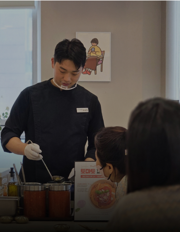 2주에 한 번, 전문 셰프와 함께하는 푸드테라피 클래스가 진행됩니다. 맛있고 건강한 식사를 통해 힐링과 영양을 동시에 채워보세요.