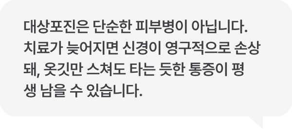 대상포진 급성기에는 24시간 심한 통증을 동반하는 수포가 발생하여 가정에서 통증 조절이 어려우며, 접촉을 통한 전염이 가능하여 각별한 주의가 필요합니다.